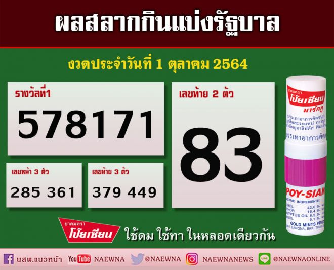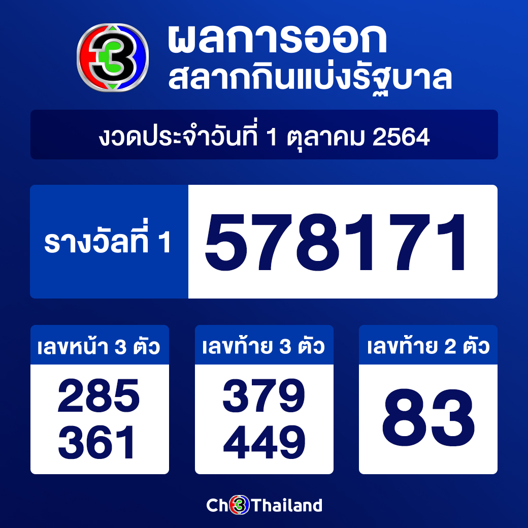 ตรวจหวย ตรวจสลากกินแบ่งรัฐบาล งวด 1 ตุลาคม 2564 ผลสลากกินแบ่งรัฐบาล 1/10/2564 เช็คผลหวย ได้ที่ mthai ผลสลากกินแบ่งรัฐบาล. เลขหน้า 3 ตัว ใหม่ 2 รางวัลๆละ 4,000 . ตรวจหวย เช็คหวย หวยรัฐบาล ตรวจสลากกินแบ่งรัฐบาล ผลสลากกินแบ่งรัฐบาลตรวจรางวัลที่ 1 สลากกินแบ่งรัฐบาล ลอตเตอรี่ . มาลุ้นกันจ้า งวดนี้ใครจะรวยติดตามการถ่ายทอดสดการออกสลากกินแบ่งรัฐบาล งวดวันที่ 1 ตุลาคม 2564#สลากกินแบ่งรัฐบาล #1 ตุลาคม 2564. วันเสาร์ ที่ 16 ตุลาคม พ.ศ.